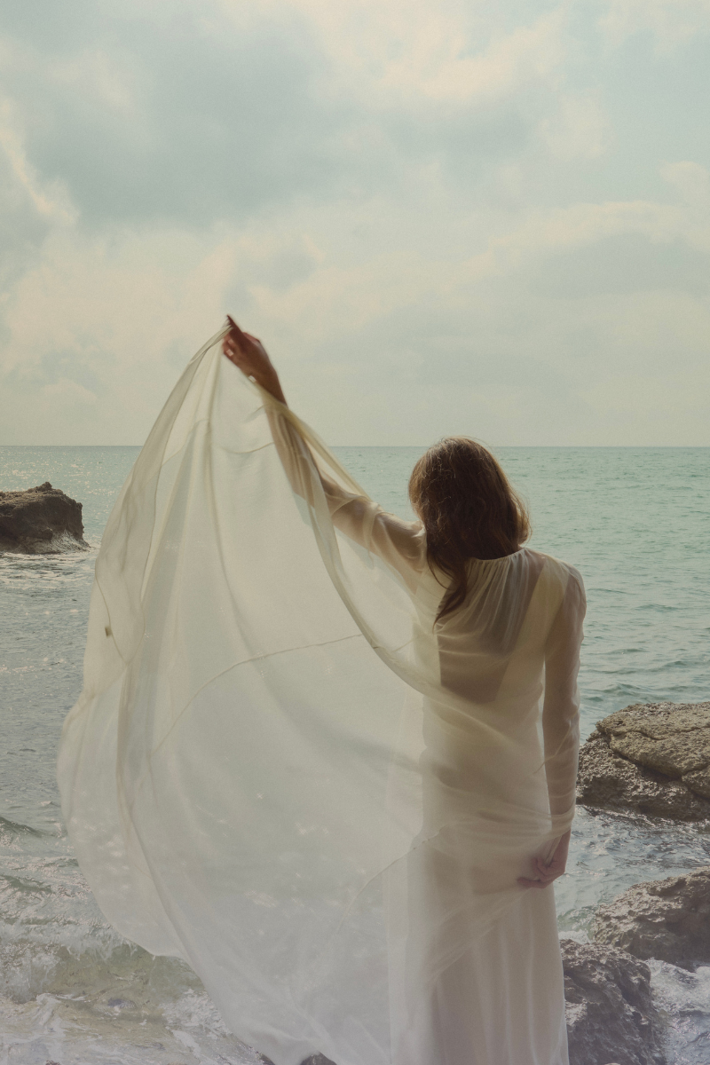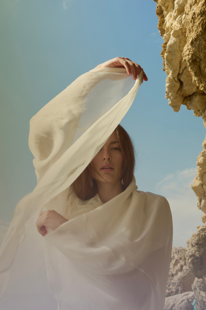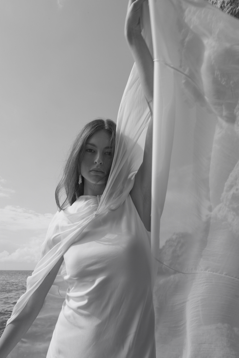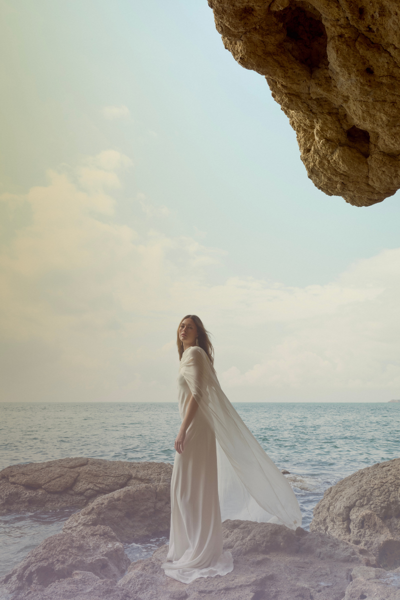 Light and airy, this silk chiffon cape adds a touch of grace and poetry to the silhouette. Its fluid and vaporous drape delicately accompanies every movement, subtly playing with transparency and light. Wear over a dress for a vaporous and refined effect.
