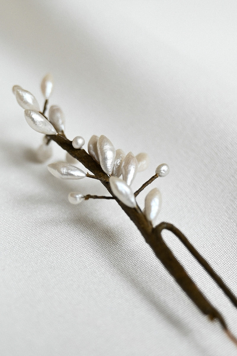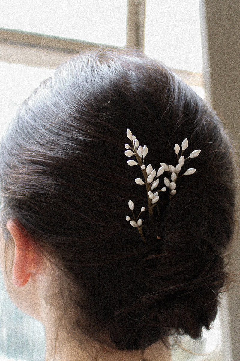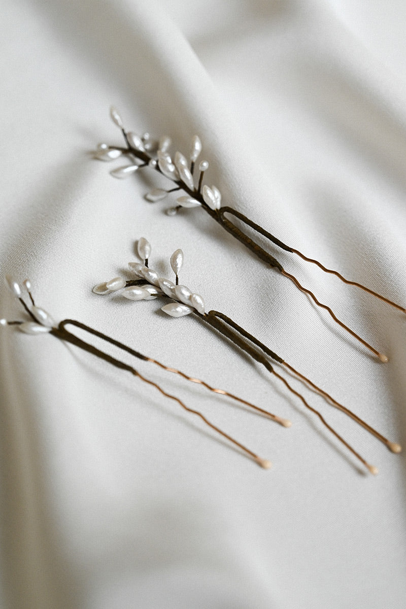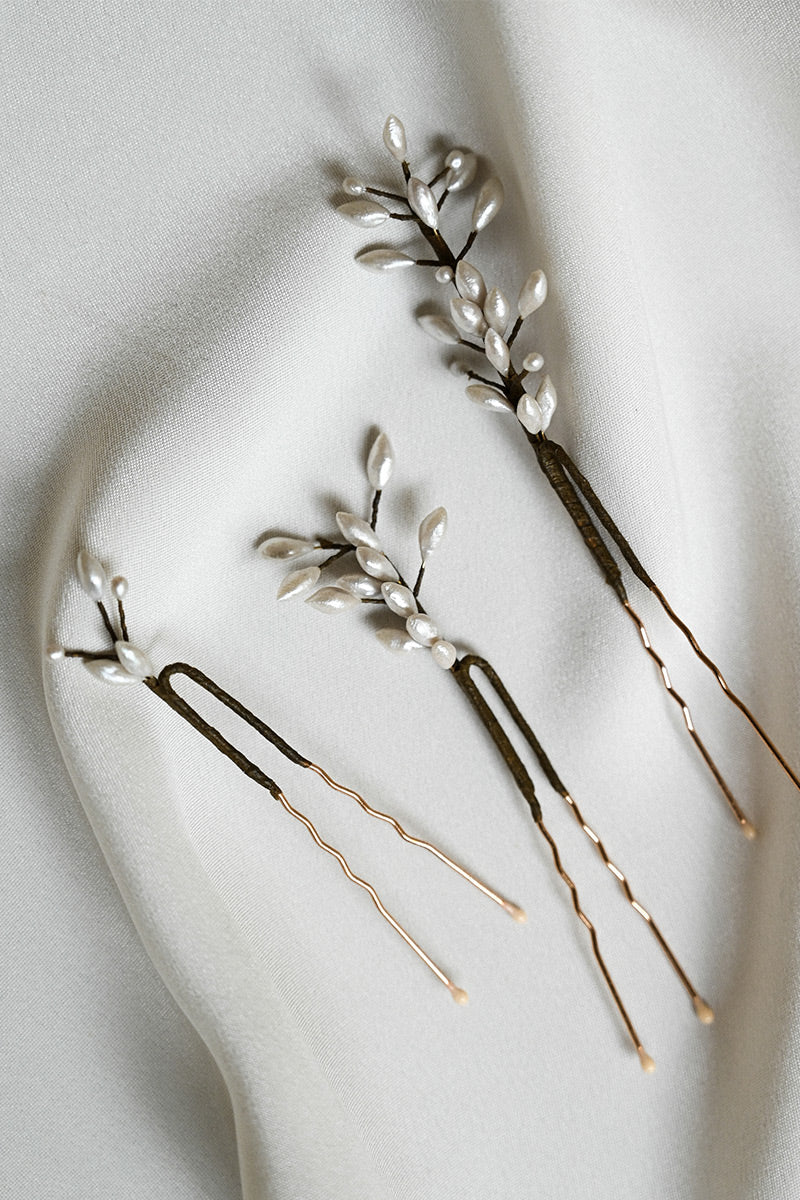 Bring light to your hairstyle with Diane: the s and three hairpins ( one small, one medium and one large) dipped in mother-of-pearl powder. Place them in your bun as desired.