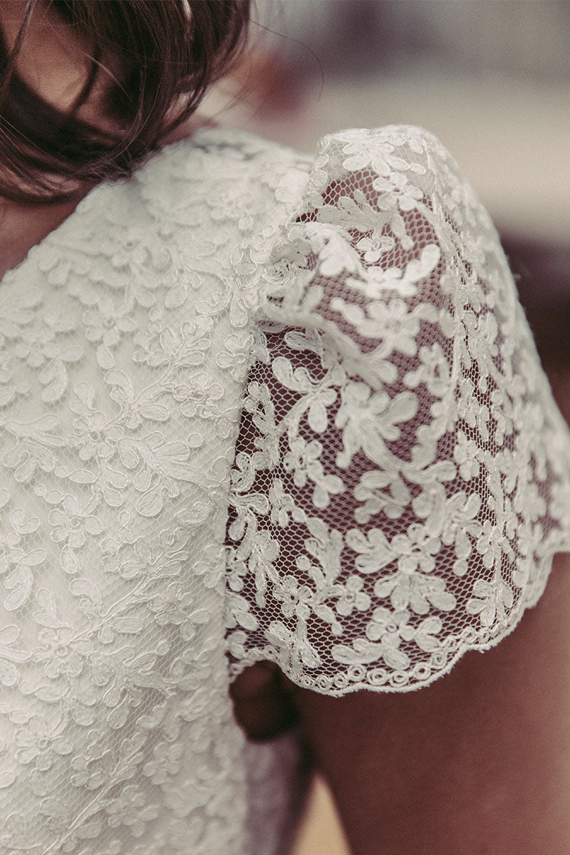 Composition: bottom of the dress 100% silk, top of the dress in lace 80% cotton, 20% polyamide.