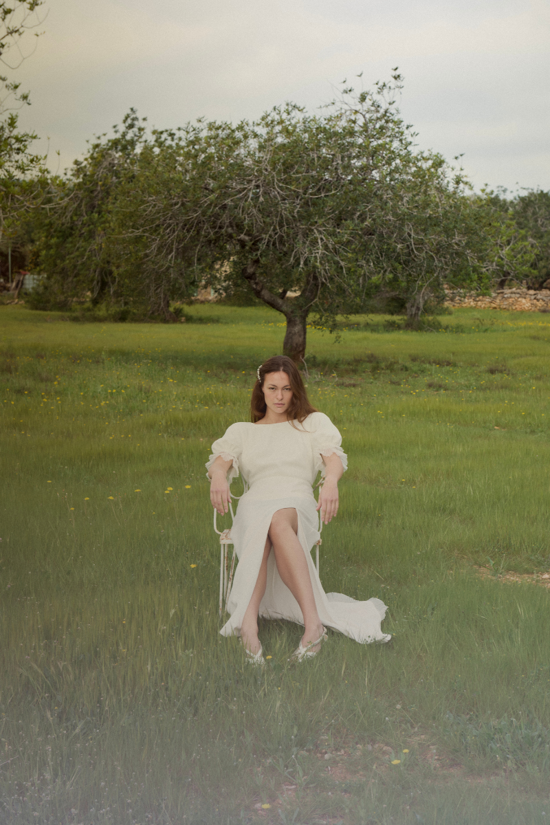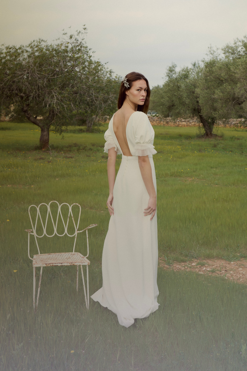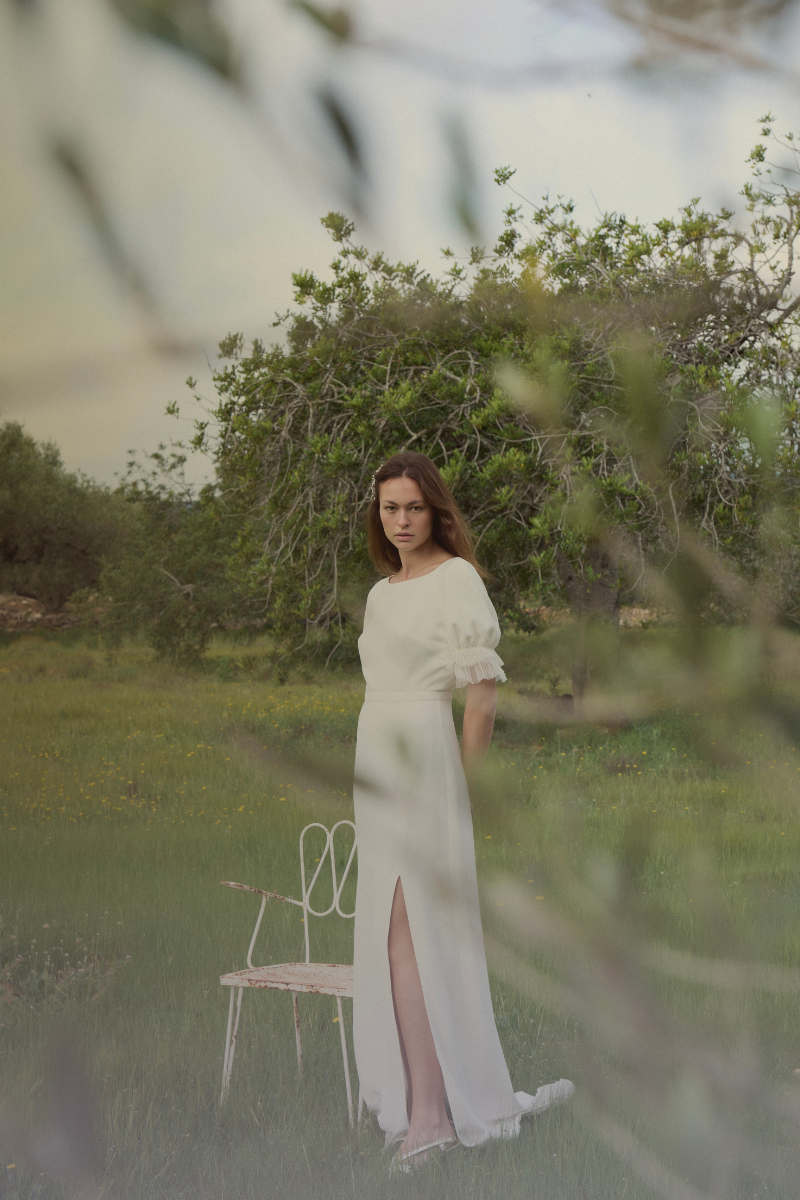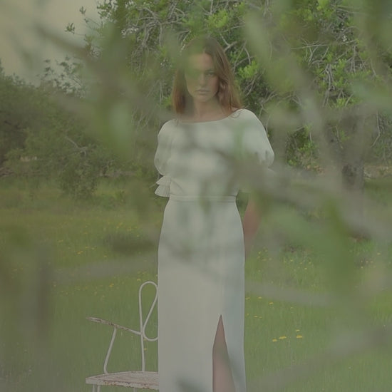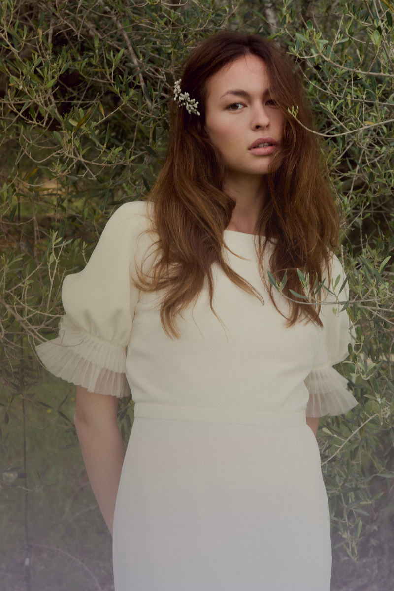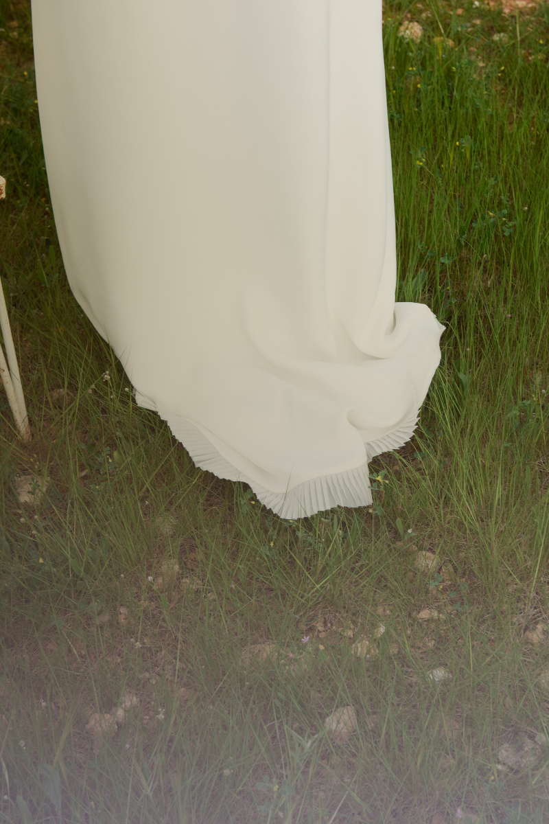 Timeless purity for the Leiria dress, whose sleek silhouette makes it both modern and infinitely soft. Crafted from silk crepe, it features subtly openworked sleeves and a pleated silk organza hem.