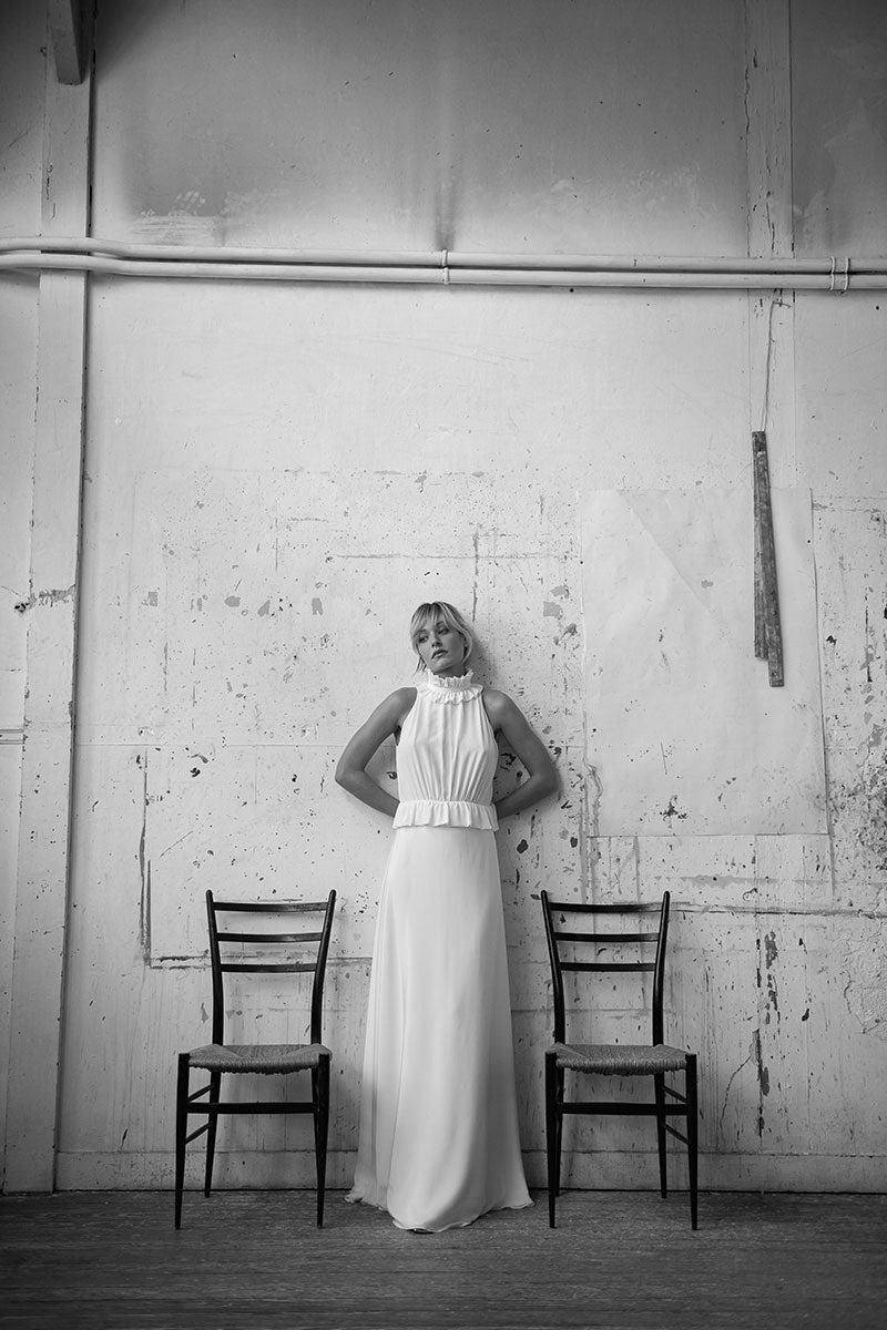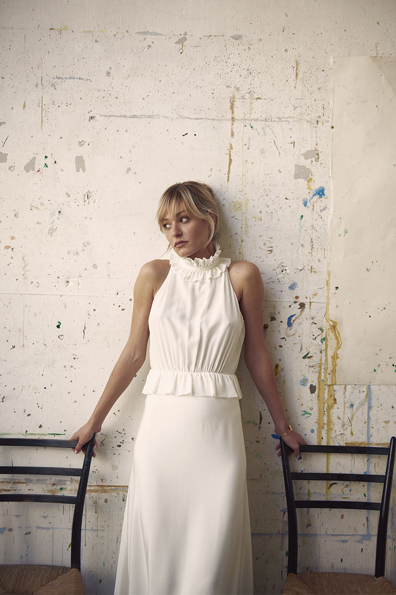 Wedding dress in brushed “peach skin” silk crepe with American armholes, ruffles around the neck and at the waist. Fluid gathered top, open teardrop back.
