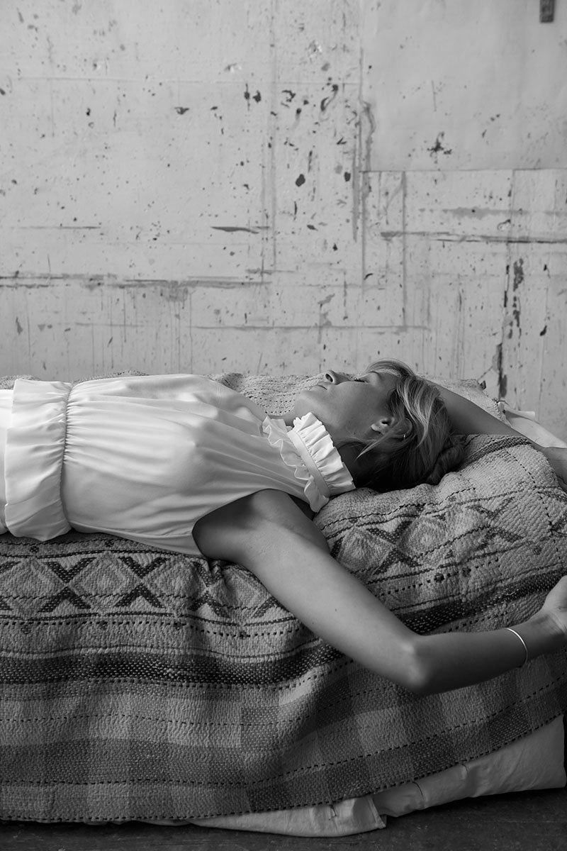 In a revisited classic style, Orsay has been imagined soft and feminine. All in silk crepe, it is adorned with delicate and skillfully balanced ruffles. The top with American armholes is also open along the entire length of the back with a slit framed by a light drape.