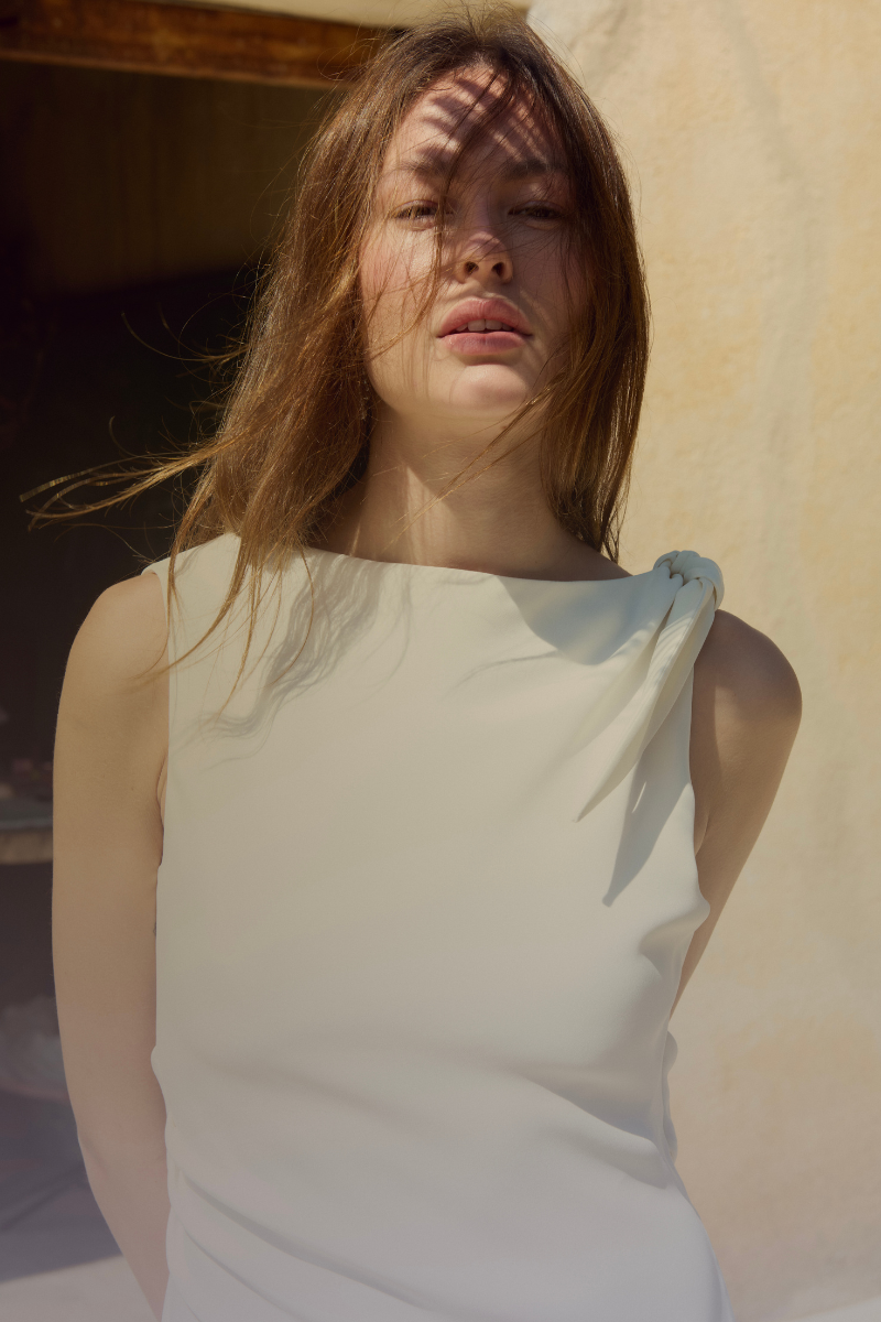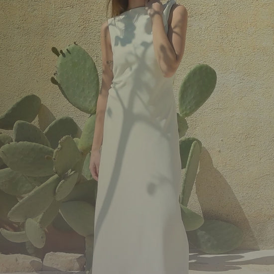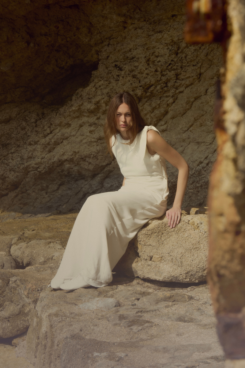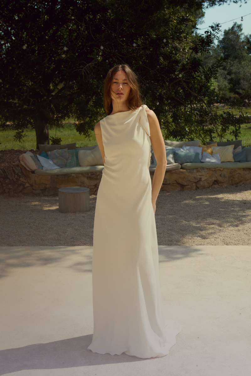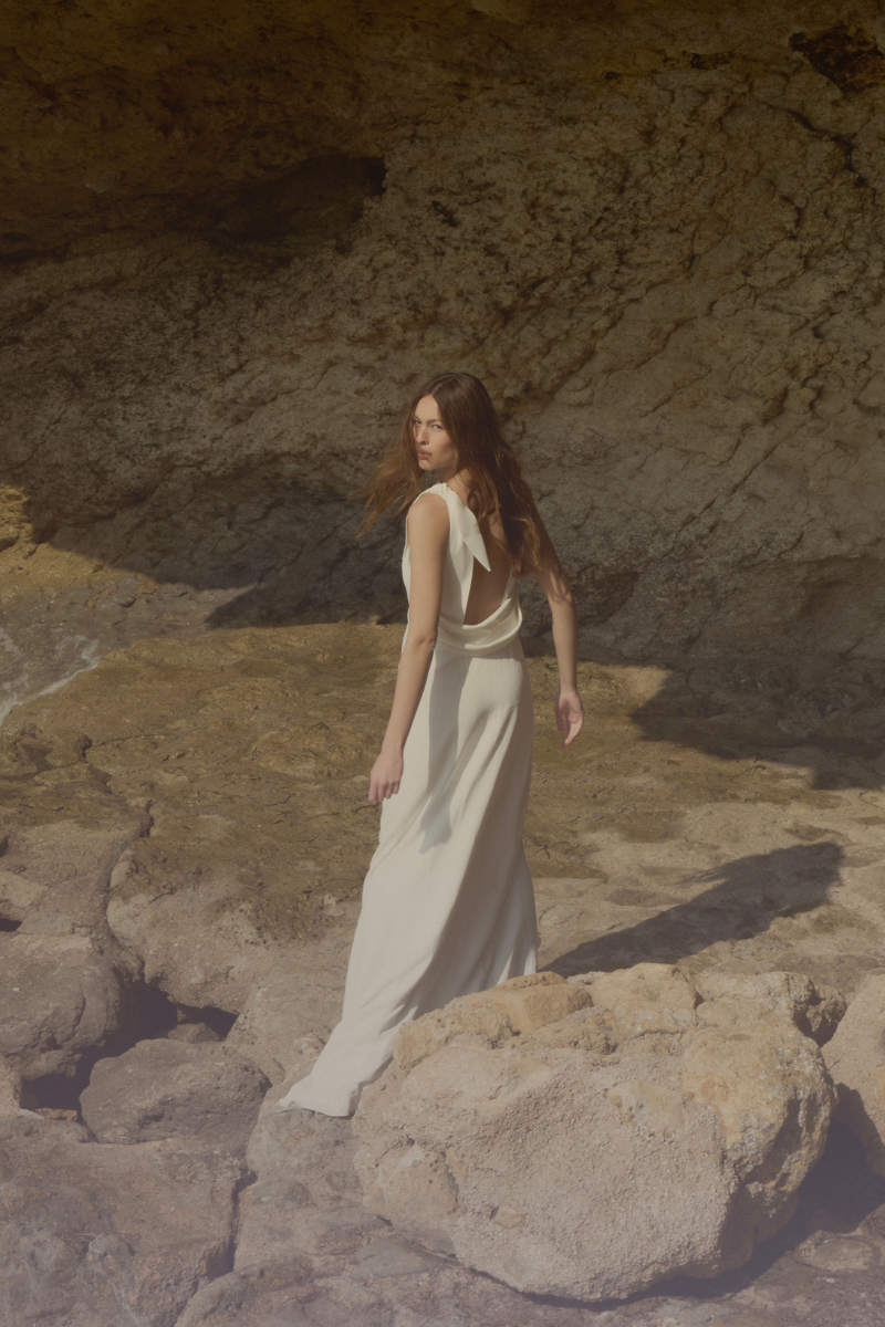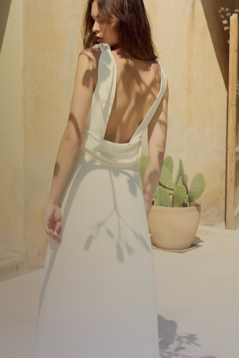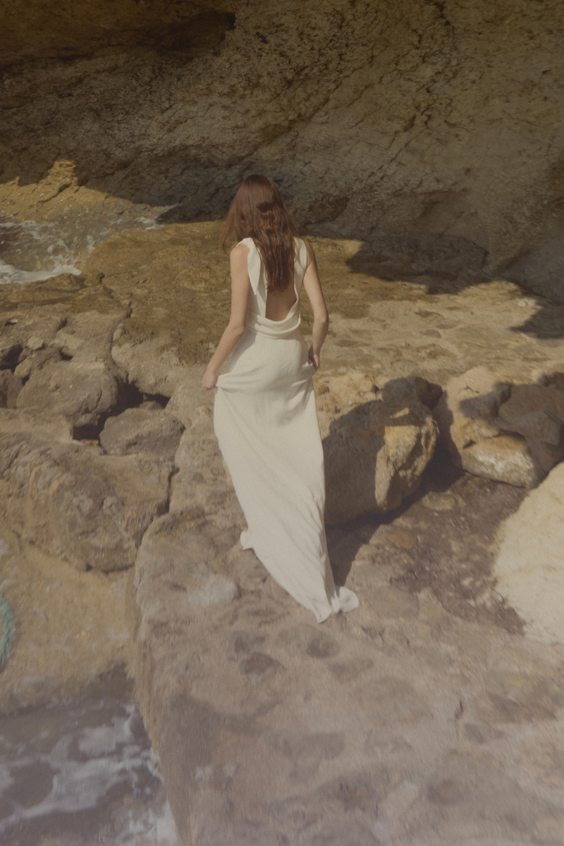The supple Ortigo dress embodies timeless elegance. Its flowing cut and delicate silhouette are enhanced by an elegant halter back.