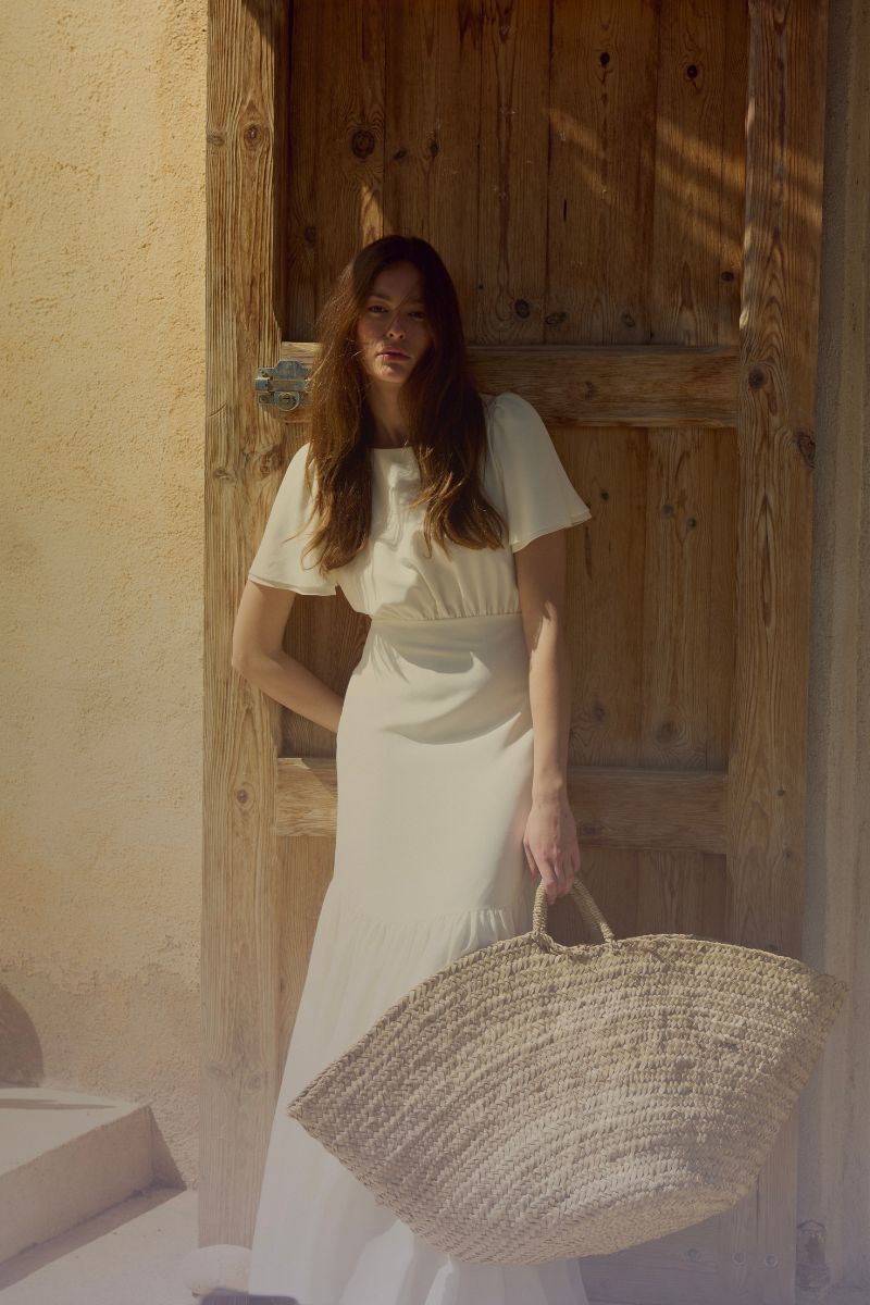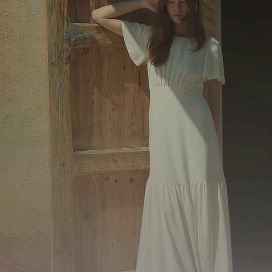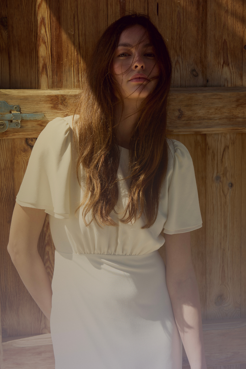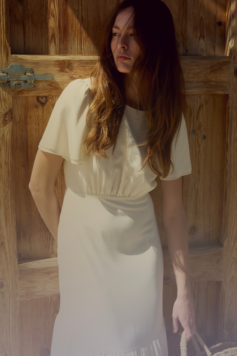 The Pias dress, simple and elegant, offers a soft and romantic silhouette. Its full skirt, slightly blousy top, and butterfly sleeves are delicately adorned with gathers, which add volume and movement to the ensemble.
