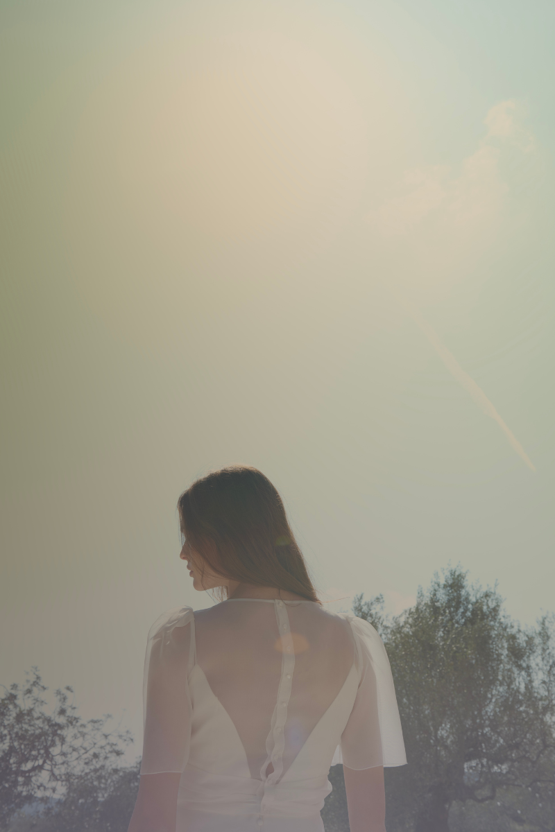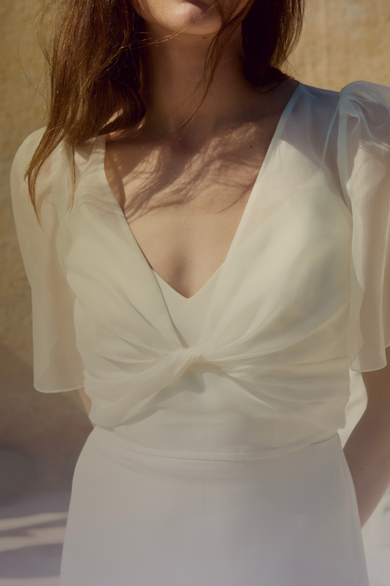 Absolute elegance: the Botija top, draped in silk organza, seduces with its finesse. Its plunging neckline brings sensuality and modernity, while the back closes with a delicate row of covered buttons.