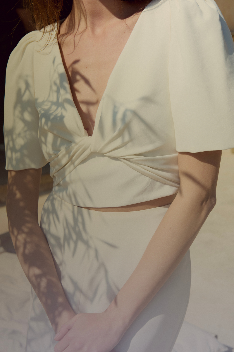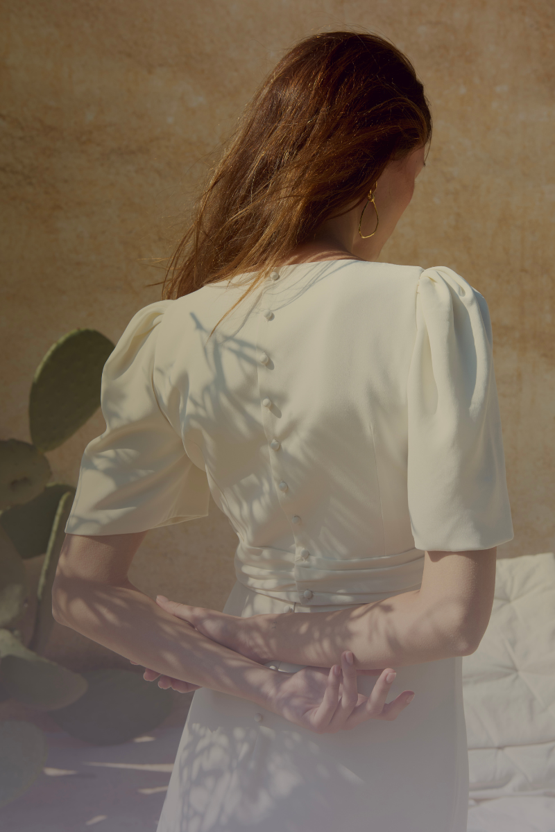 Absolute elegance: the Lomba top, draped in the most delicate silk, seduces with its finesse. Its plunging neckline brings sensuality and modernity, while the back fastens with a delicate row of covered buttons.