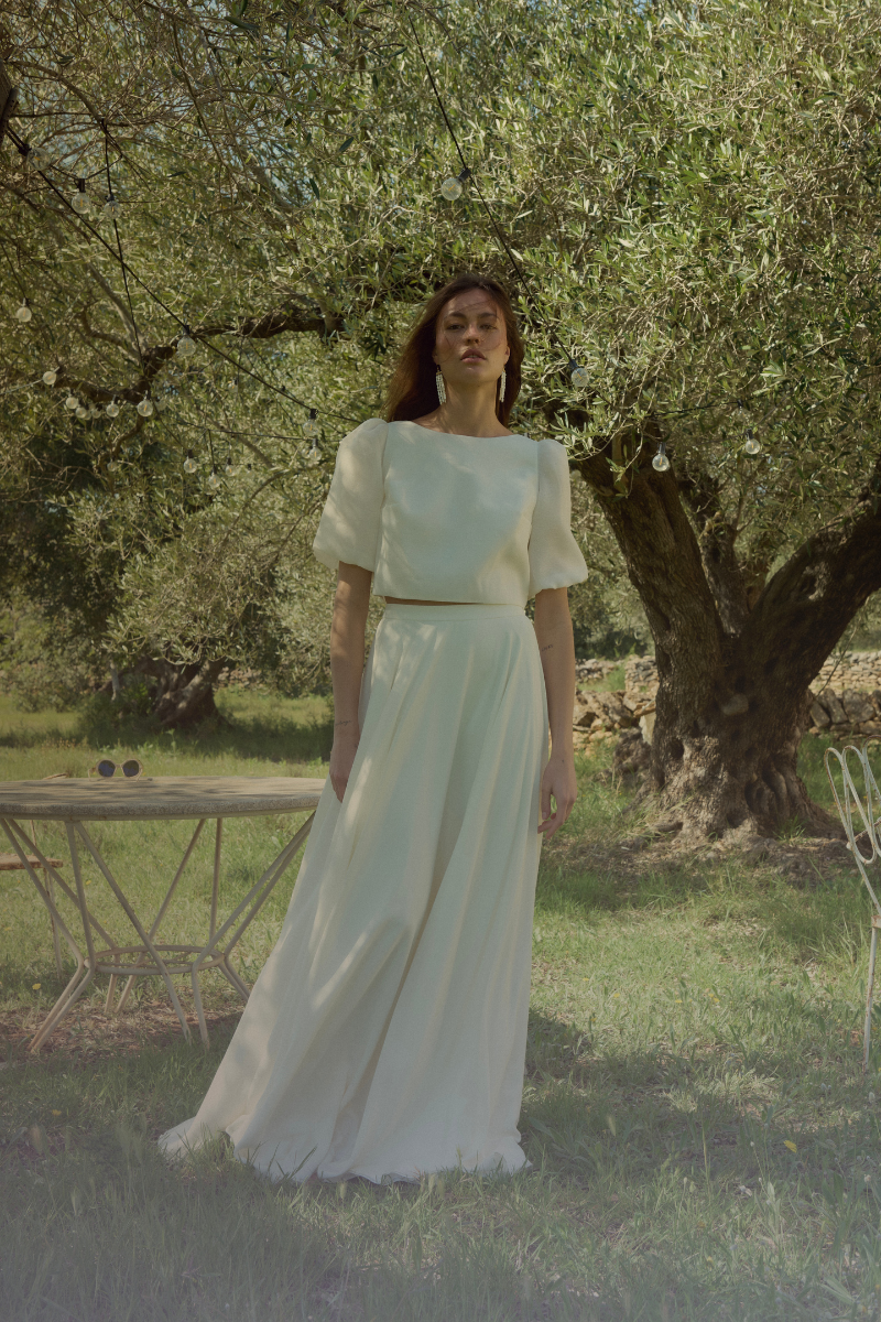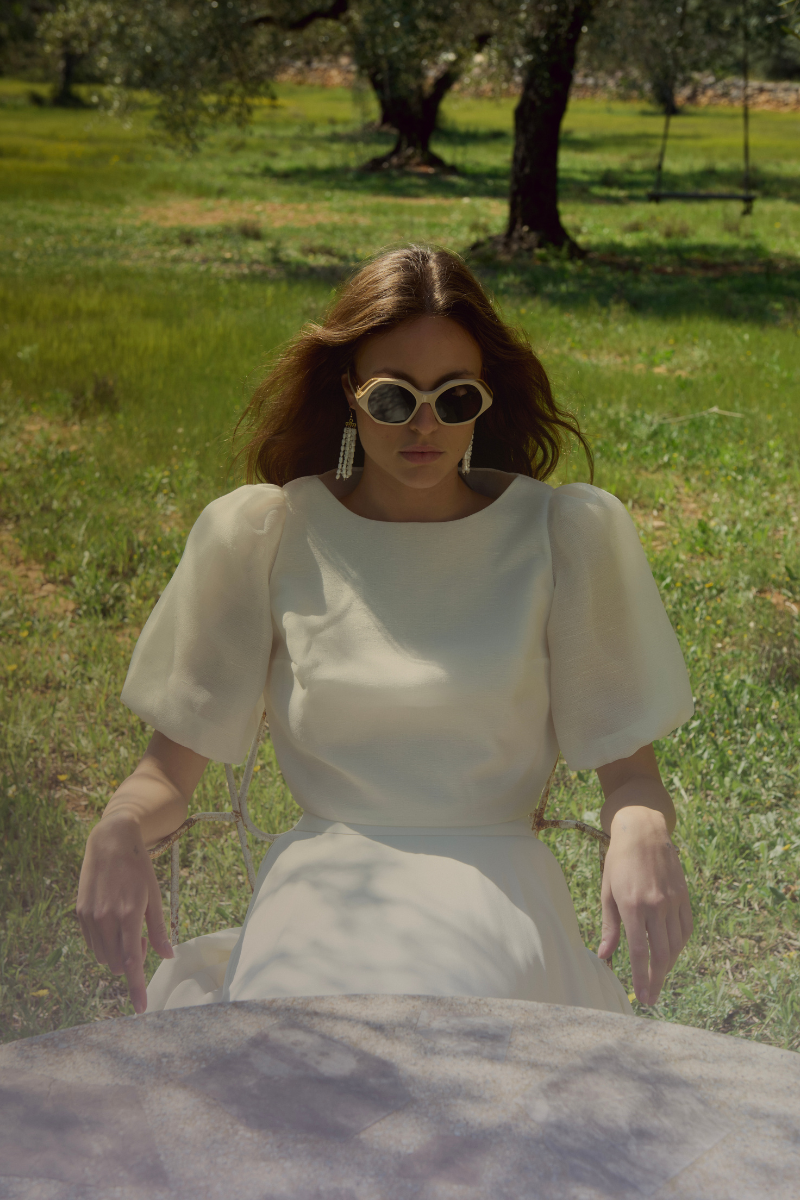 Volume and transparency for the Nazaré top, refined, right down to the small pearly buttons that close it. It can be worn over a dress or paired with a skirt.