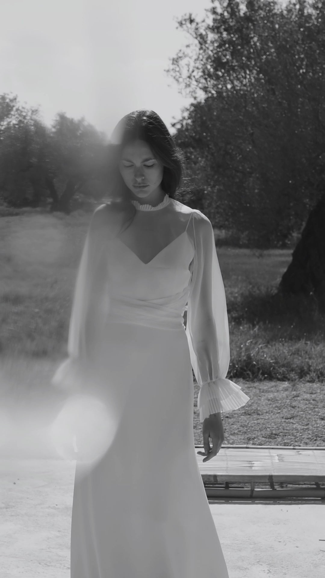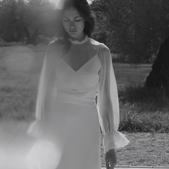 This sheer silk organza top embodies lightness and refinement. Its high neck and long pleated sleeves give it a couture touch, while its fitted cut subtly and delicately enhances the silhouette.