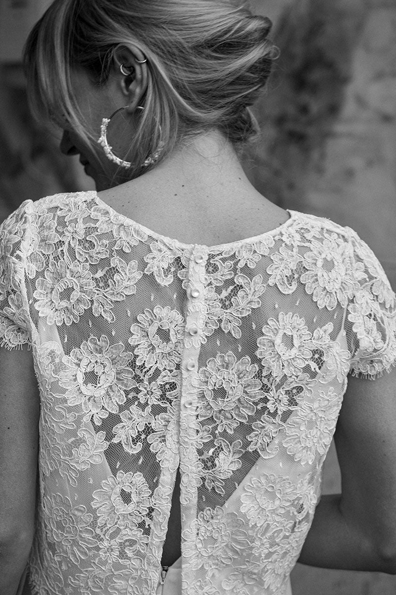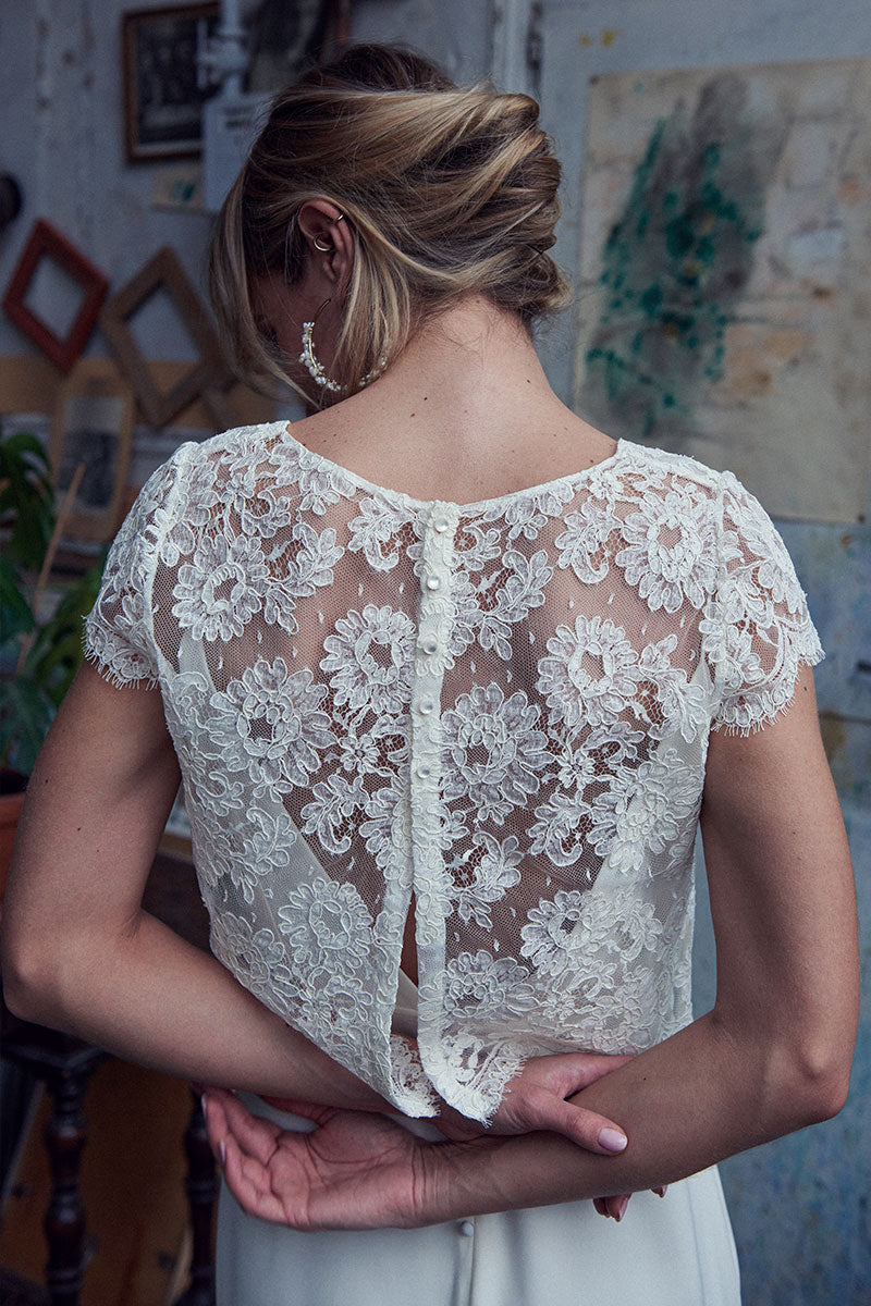 Top in embroidered Calais lace, V-neckline at the front and short sleeves.
