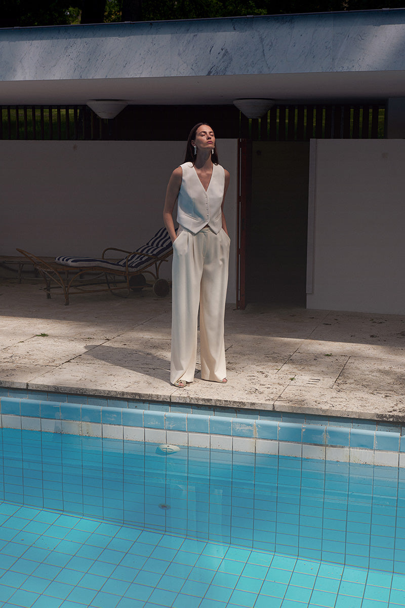 Men's-inspired waistcoat in wool crepe. V-neck, button front.