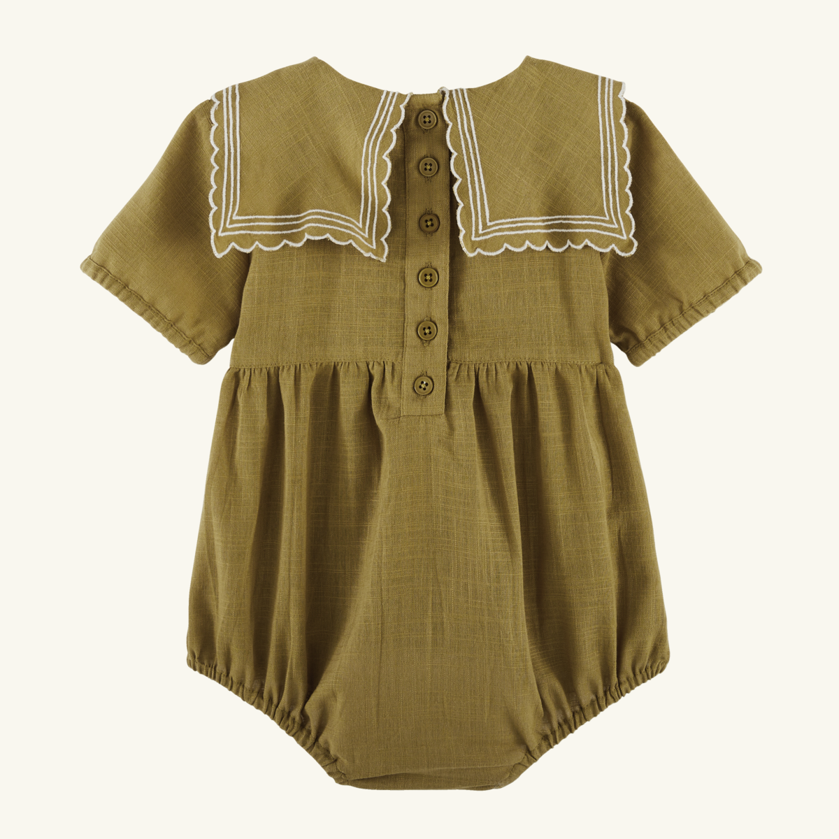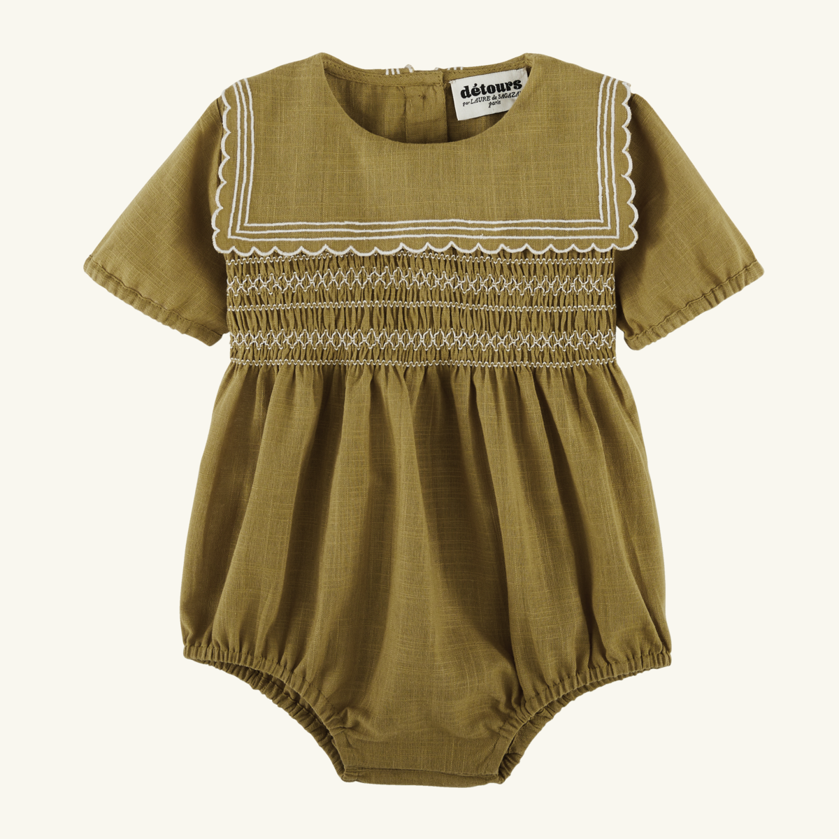 Barboteuse avec empiècement smocké devant et dos et broderies. Collerette volantée. Manches courtes bordées d’un galon de dentelle avec détail smocké. Patte de boutonnage au dos avec petits boutons en bois. Boutons pression au niveau de l’entrejambe, cuisses élastiquées.