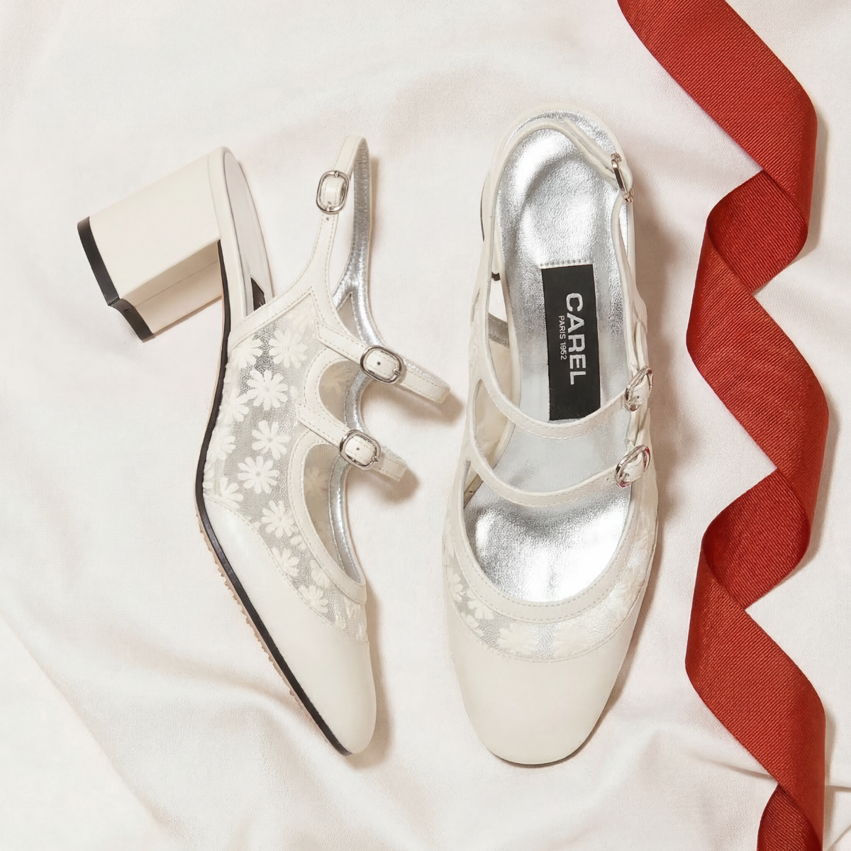 C’est tout naturellement que Carel s’associe aujourd’hui à la maison Laure de Sagazan, figure incontournable depuis 2011 de la mode nuptiale contemporaine. Cette démarche d’upcycling devient le point de départ de la collection : les dentelles, soigneusement sélectionnées, sont intégrées aux chaussures pour dialoguer avec les robes de la créatrice, donnant une nouvelle vie à ces matières délicates en les appliquant sur certains modèles iconiques de Carel artisanale.