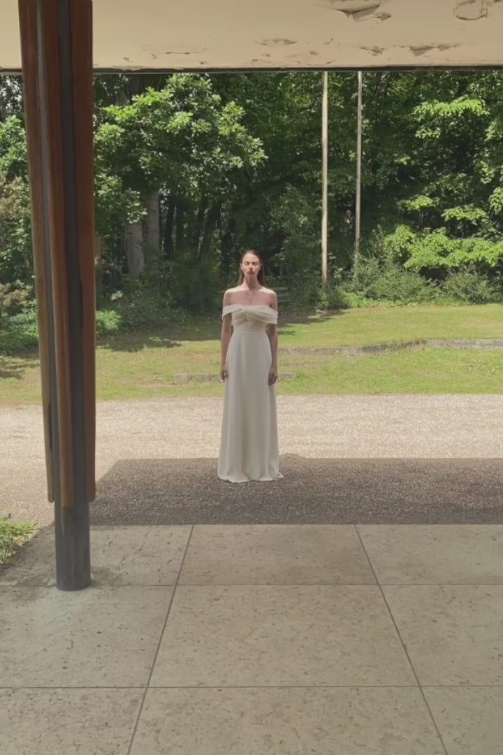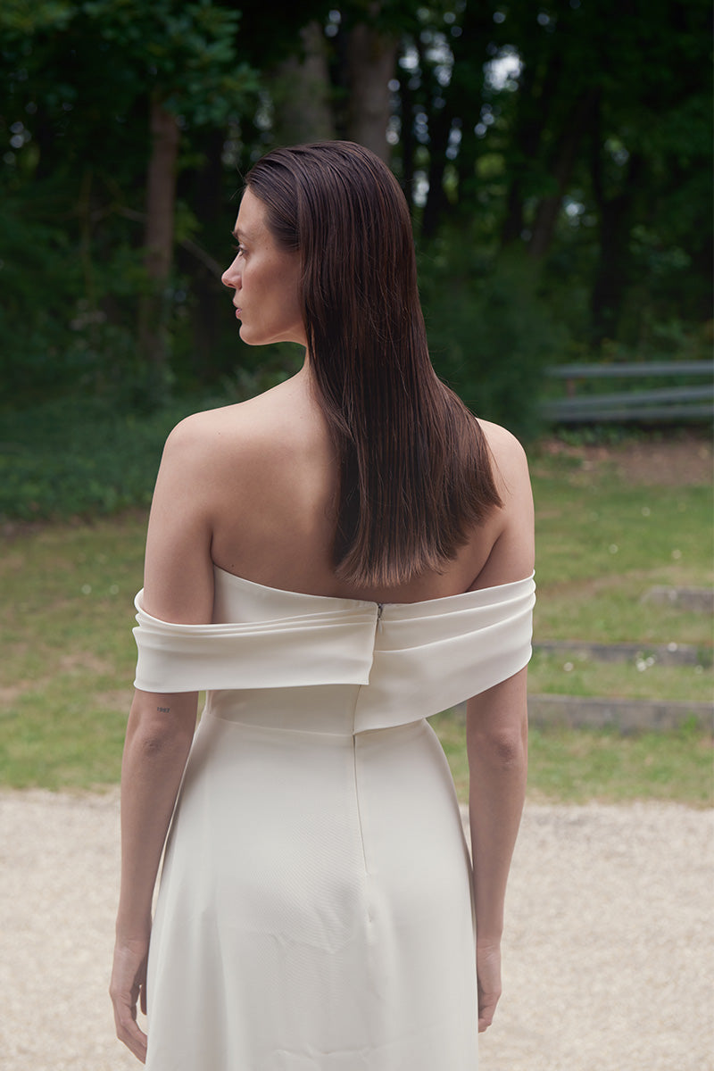 Vestido palabra de honor en crepé de seda grueso, decorado con un drapeado de gazar de seda en hombros y pecho.