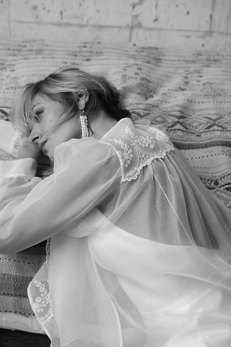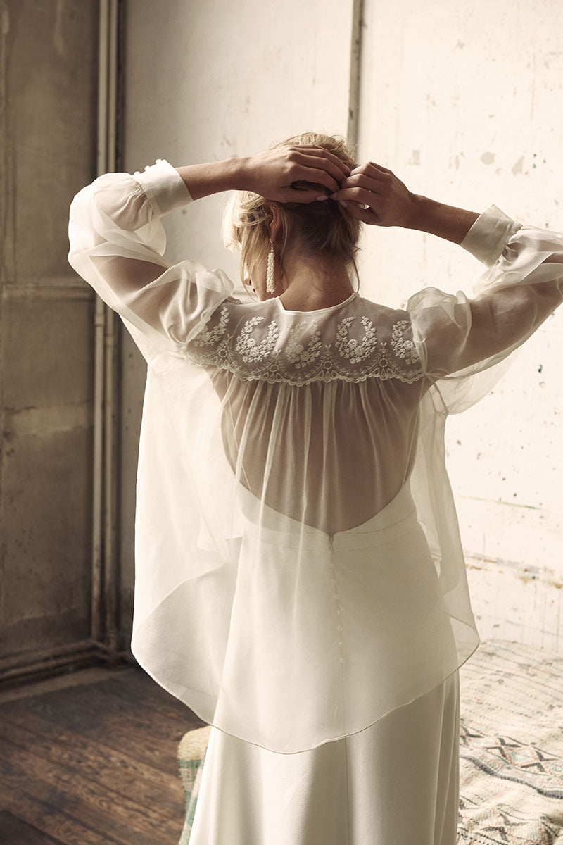 El top Tolbiac: atemporal. Nuestro top de corte amplio confeccionado en organza de seda, combina perfectamente con todos nuestros vestidos. Con escote en pico y espalda fruncida, Tolbiac tiene un toque especial con sus detalles de tul bordado.