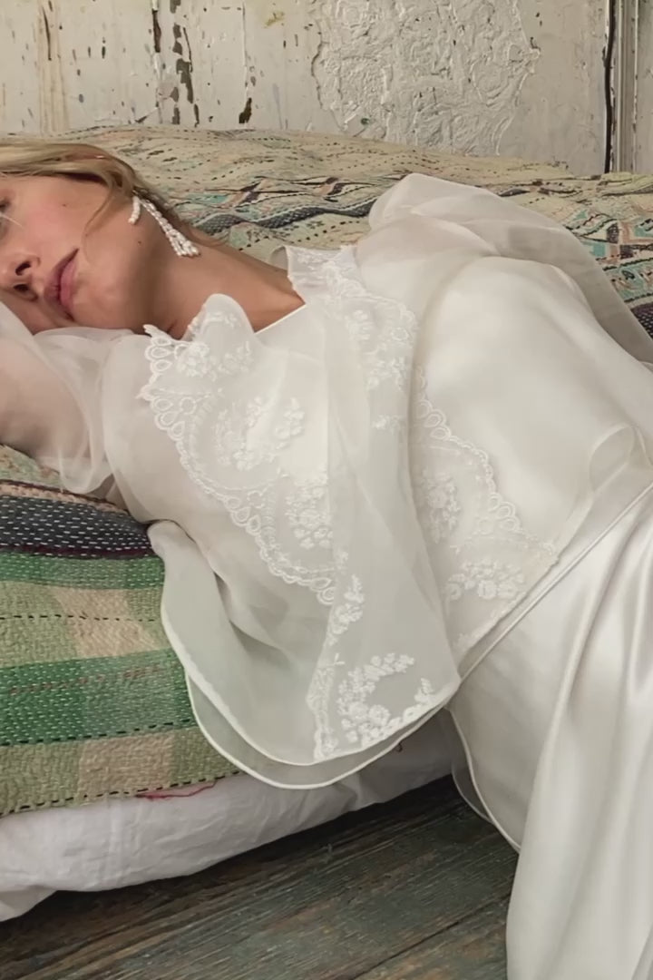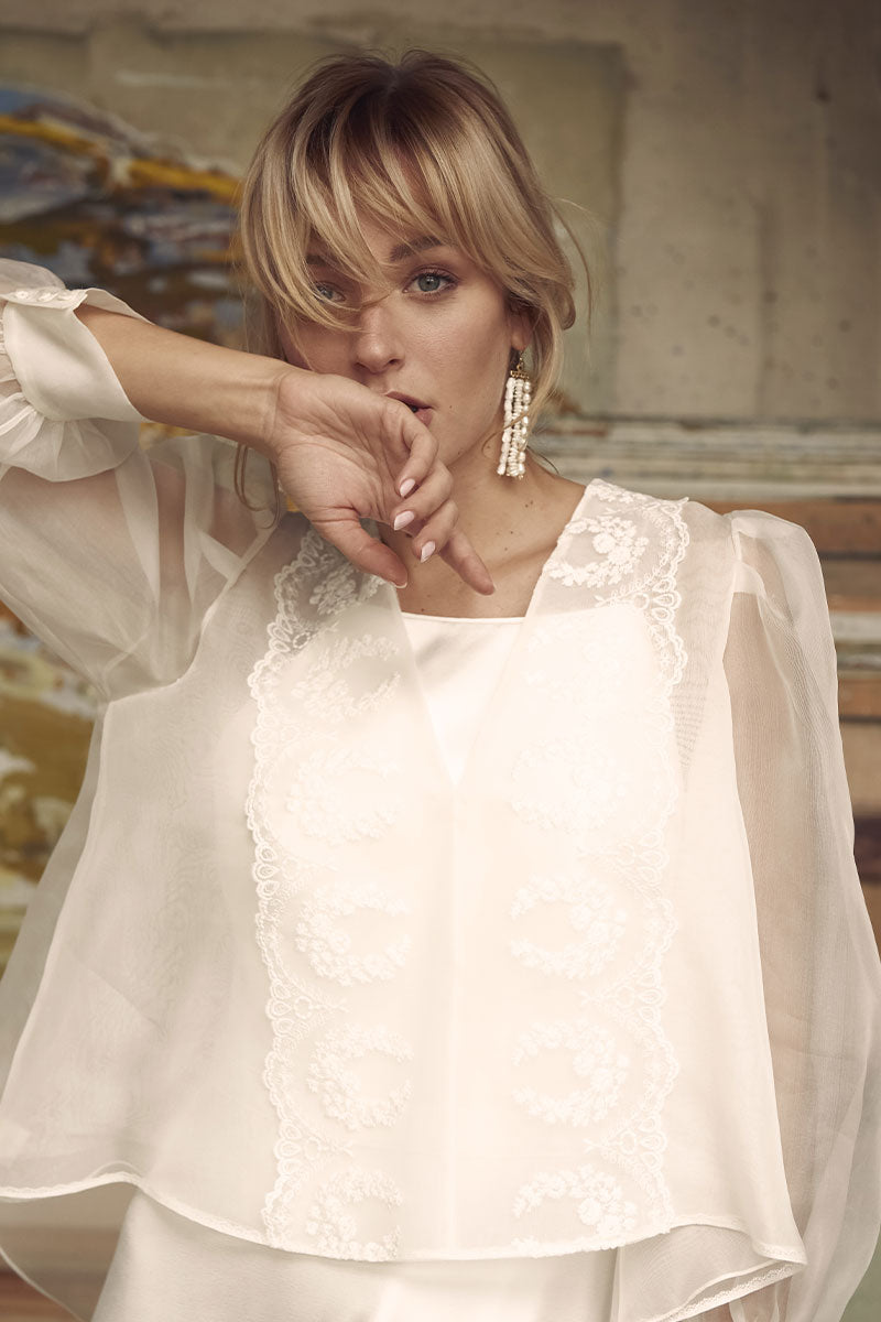 Blusa de corte ancho en organza de seda y tul bordado. Escote en pico con fruncido en la espalda. Manga larga.