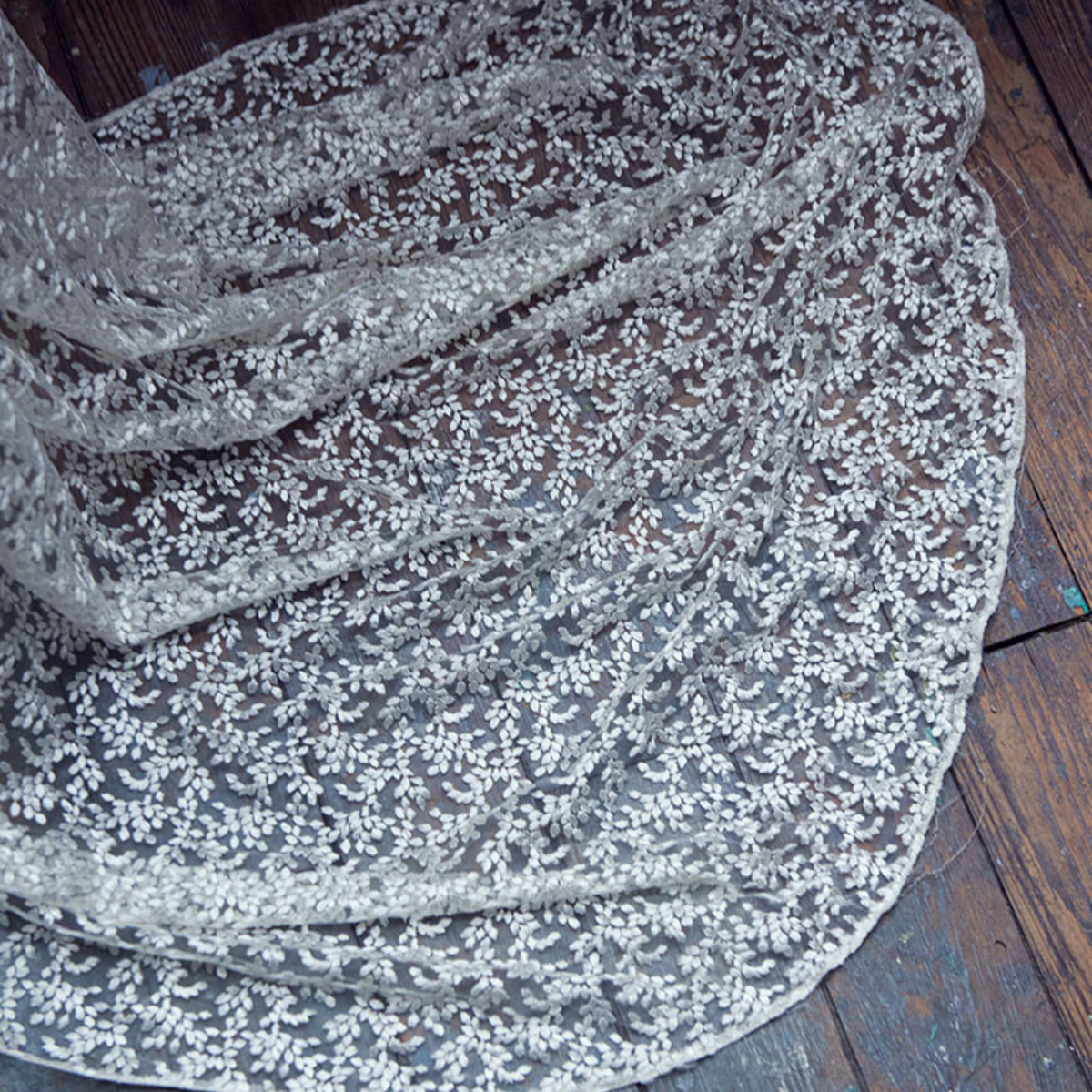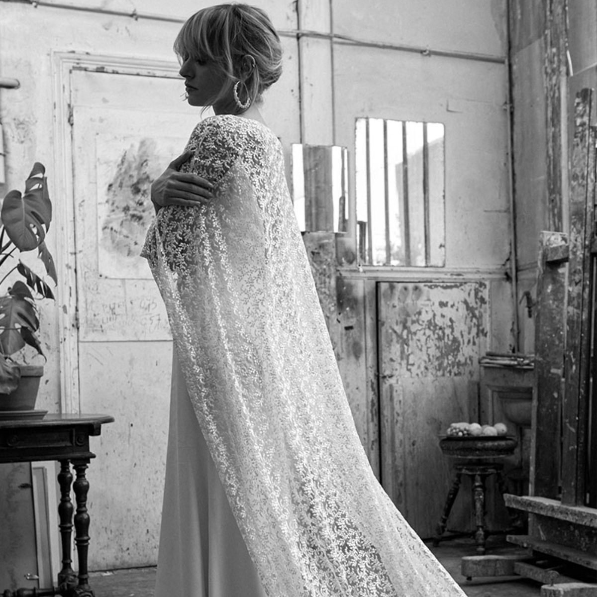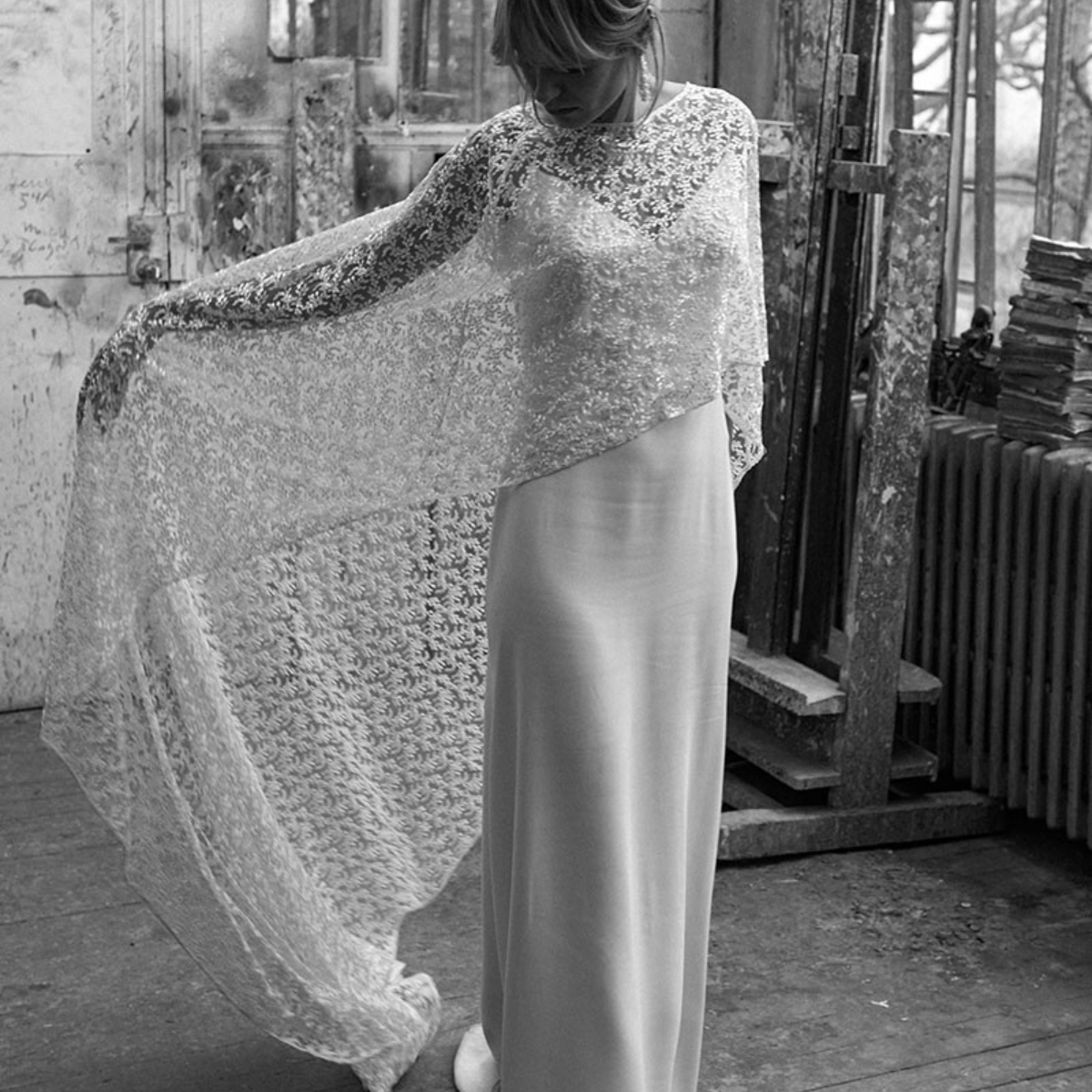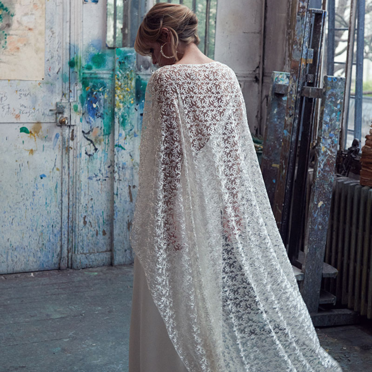 Cape en tulle brodé d'un fil satiné. S'enfile par la tête pour recouvrir les épaules et le décolleté.