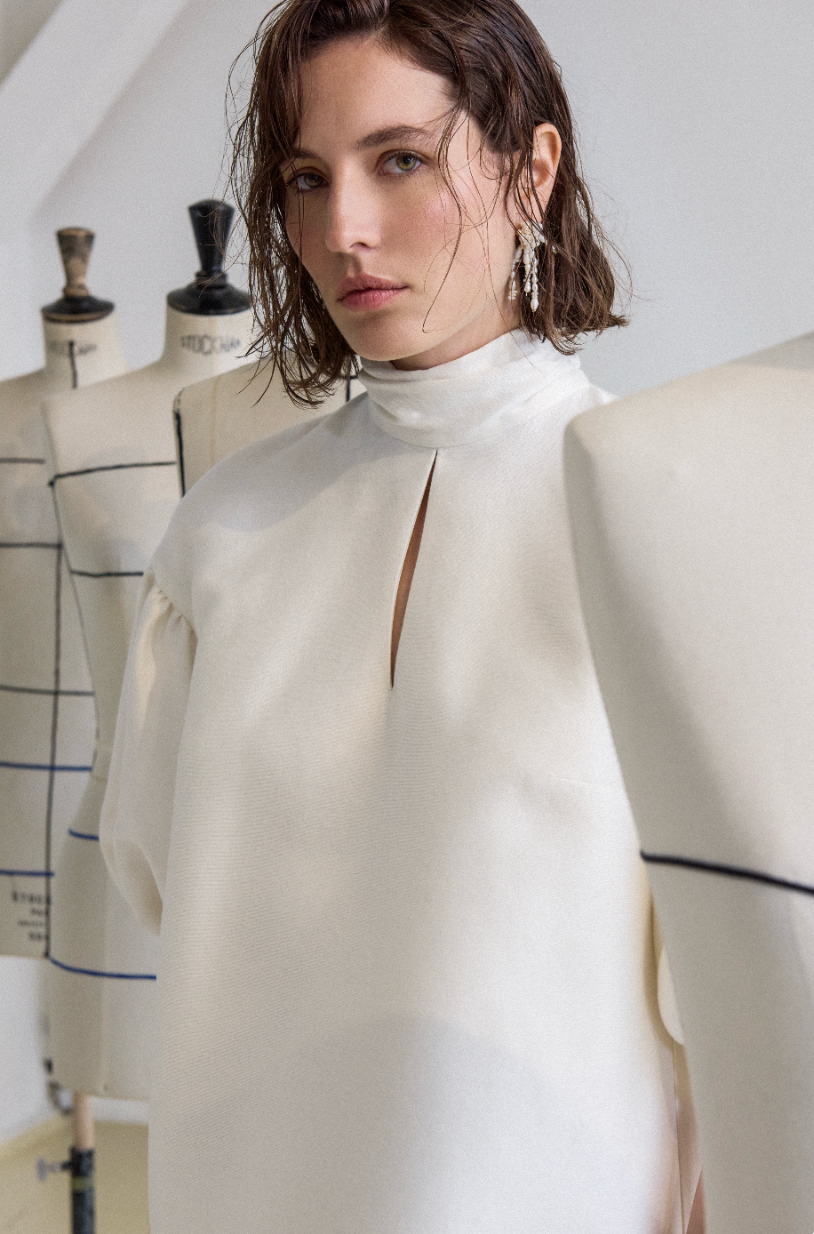 Robe courte à manches bouffantes. Col montant avec écharpe tombante à l'arrière. Ouverture en goutte sur l'avant.