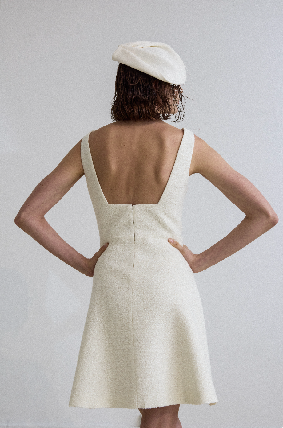 Robe courte en tweed à forme trapèze et décolleté carré devant et dos.