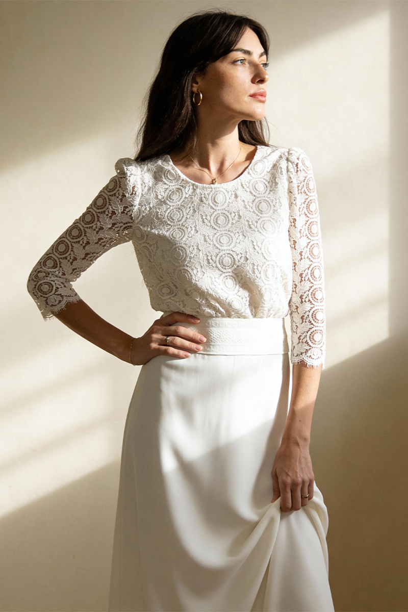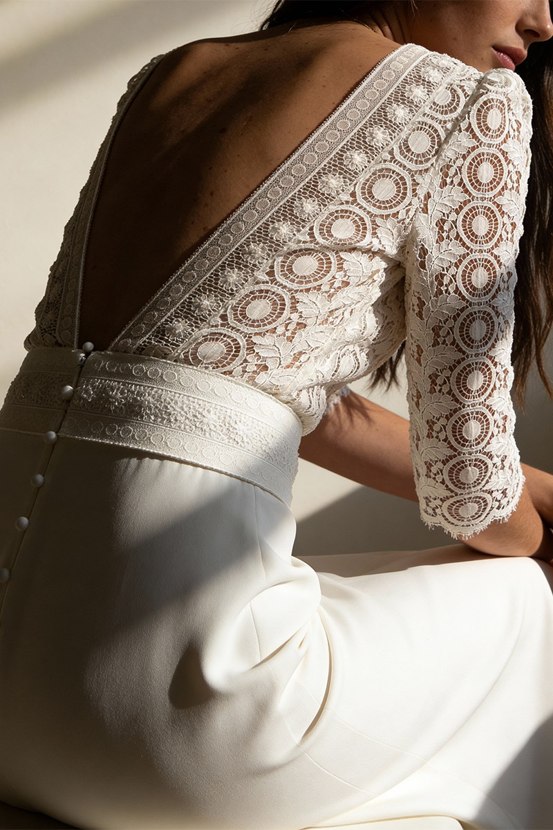 La robe Sorbonne en dentelle de Calais et crêpe de soie.