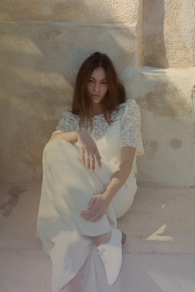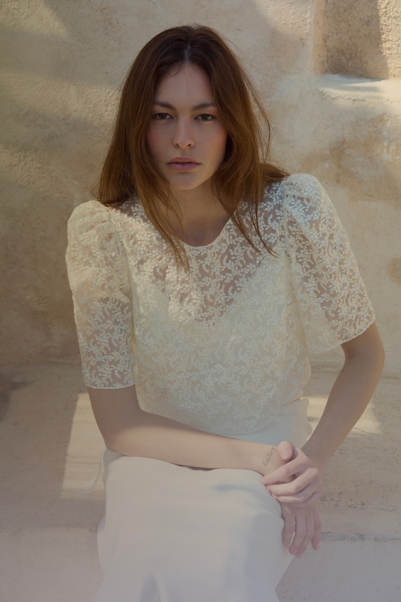 Tout en transparence et en délicatesse, le top Covelo en organza de soie brodé se porte à merveille par-dessus nos robes. Ses manches légèrement volumineuses et son nœud en organza de soie dans le dos en font une touche délicate et poétique.