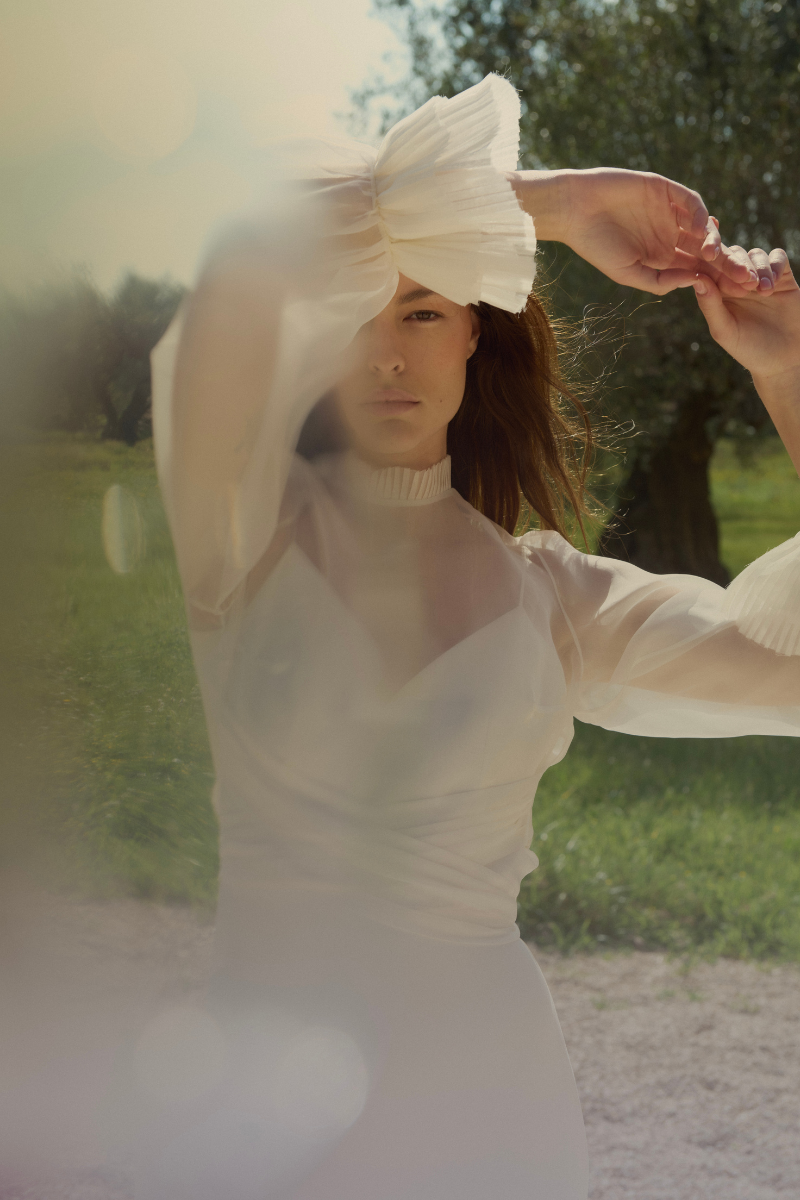 Tout en transparence, ce top en organza de soie incarne légèreté et raffinement. Son col montant et ses manches longues plissées lui confèrent une touche couture, tandis que sa coupe cintrée sublime la silhouette avec délicatesse et subtilité.