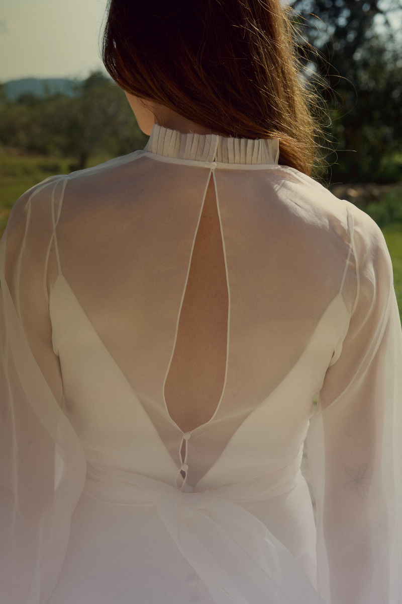 Top en organza de soie, manches longues. Détails de plissés d'organza de soie en bas de manches et au col. Ceinture drapée à nouer autour de la taille. Goutte au dos.